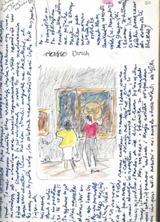 Niet alleen Wouter Overhaus (1962) houdt van kijken naar mensen die kijken – en legt dat vast. Het is ook een terugkerend thema in het oeuvre van Józef Czapski (1896-1993). Czapski was zelf schilder, schrijver en essayist, en bezocht graag musea. Daar observeerde hij niet alleen de kunst (waar hij dan weer mooie essays over schreef), maar ook de mensen die naar die kunst keken. Hij schetste ze in zijn dagboeken (die hij zijn hele leven bijhield, getekend en geschreven, hij werd bijna honderd). Dat zag er bijvoorbeeld zo uit: